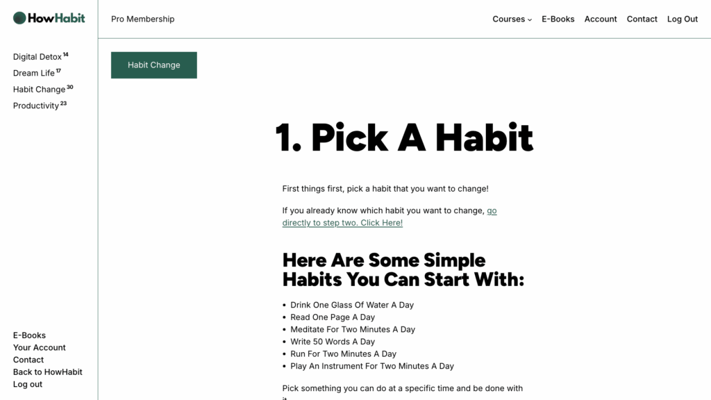 Das Ziel war es, eine Website zu schaffen, die optisch überzeugt und zugleich zuverlässig funktioniert. Sie sollte Besucher anziehen, Leads generieren und Mitglieder exklusiven Zugriff auf Inhalte bieten. Außerdem wollte ich eine Seite, die meine eigenen Interessen am Thema Gewohnheiten ändern widerspiegelt.